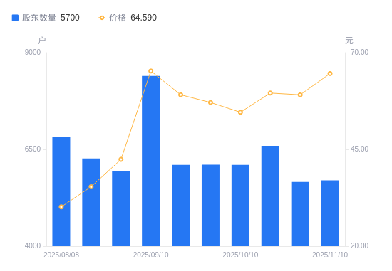 近一年(2024年11月20日至2025年11月10日),开创电气A股股东户数从8660户,减低至5700户,降幅34.18%,区间股价上涨200.14%。