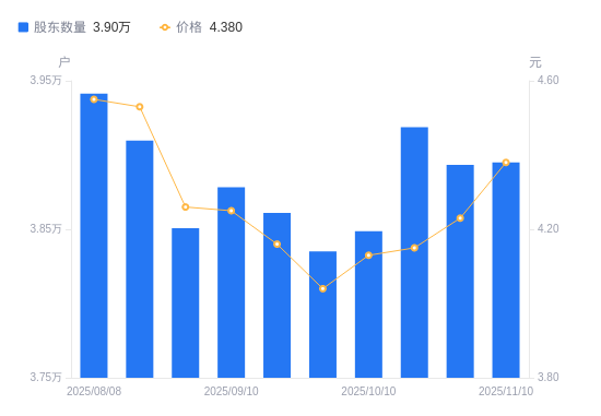 近一年(2024年11月20日至2025年11月10日),津药药业A股股东户数从4.26万户,减低至3.9万户,降幅8.57%,区间股价上涨2.77%。