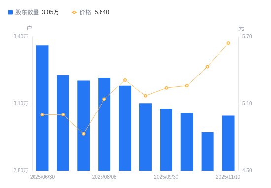 近一年(2024年11月20日至2025年11月10日),德联集团A股股东户数从3.42万户,减低至3.05万户,降幅10.88%,区间股价上涨26.46%。