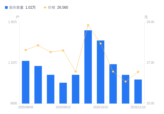 近一年(2024年11月20日至2025年11月10日),东星医疗A股股东户数从1.11万户,减低至1.02万户,降幅8.38%,区间股价上涨1.18%。