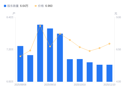 近一年(2024年11月10日至2025年11月10日),友阿股份A股股东户数从5.38万户,增加至6.64万户,增幅23.43%,区间股价上涨93.07%。