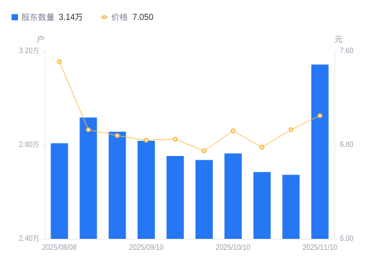 近一年(2024年11月20日至2025年11月10日),新筑股份A股股东户数从3.11万户,增加至3.14万户,增幅0.93%,区间股价上涨49.05%。