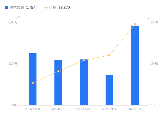 近一年(2024年12月31日至2025年10月31日),华瑞股份A股股东户数从1.36万户,增加至1.75万户,增幅29.43%,区间股价上涨42.54%。