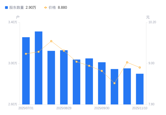 近一年(2024年12月31日至2025年11月10日),三态股份A股股东户数从3.18万户,减低至2.9万户,降幅8.70%,区间股价下跌2.20%。