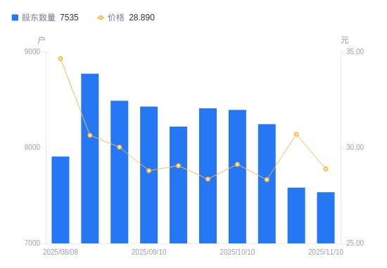 近一年(2024年11月20日至2025年11月10日),久量股份A股股东户数从8210户,减低至7535户,降幅8.22%,区间股价上涨20.88%。