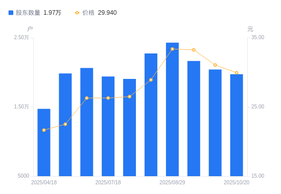 近一年(2024年12月10日至2025年11月10日),朝阳科技A股股东户数从1.63万户,增加至1.98万户,增幅21.37%,区间股价上涨12.51%。
