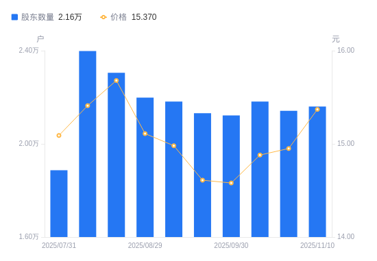 近一年(2024年11月20日至2025年11月10日),桂林三金A股股东户数从1.68万户,增加至2.16万户,增幅28.62%,区间股价上涨6.22%。