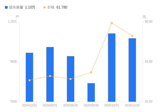 近一年(2024年12月31日至2025年11月10日),国缆检测A股股东户数从1.01万户,增加至1.1万户,增幅9.02%,区间股价上涨19.17%。