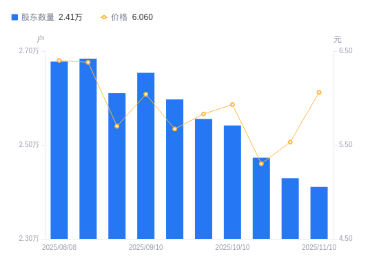 近一年(2024年11月20日至2025年11月10日),如意集团A股股东户数从2.44万户,减低至2.41万户,降幅1.17%,区间股价上涨24.44%。