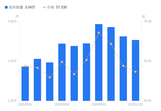 近一年(2024年12月20日至2025年11月10日),星宸科技A股股东户数从2.62万户,增加至3.04万户,增幅16.28%,区间股价下跌18.40%。