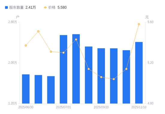 近一年(2024年11月30日至2025年11月10日),同德化工A股股东户数从1.88万户,增加至2.41万户,增幅28.14%,区间股价下跌0.36%。