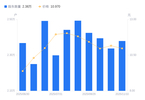 近一年(2024年12月31日至2025年11月10日),道道全A股股东户数从2.45万户,减低至2.38万户,降幅3.00%,区间股价上涨34.67%。
