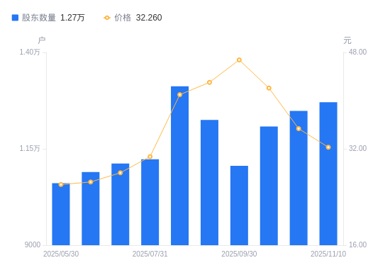 近一年(2024年12月31日至2025年11月10日),溯联股份A股股东户数从1.36万户,减低至1.27万户,降幅6.78%,区间股价上涨66.70%。
