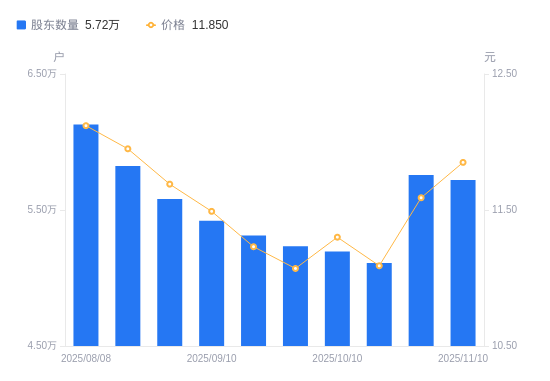 近一年(2024年11月29日至2025年11月10日),青龙管业A股股东户数从5.73万户,减低至5.72万户,降幅0.20%,区间股价下跌2.96%。