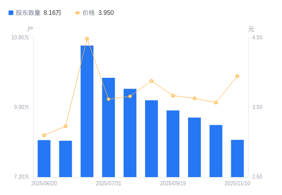 近一年(2024年11月20日至2025年11月10日),拓日新能A股股东户数从8.63万户,减低至8.16万户,降幅5.48%,区间股价上涨9.12%。