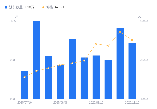 近一年(2024年12月20日至2025年11月10日),宏盛股份A股股东户数从9166户,增加至1.18万户,增幅28.33%,区间股价上涨157.53%。
