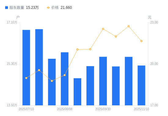 近一年(2024年11月29日至2025年11月10日),有研新材A股股东户数从17.94万户,减低至15.23万户,降幅15.09%,区间股价上涨6.59%。
