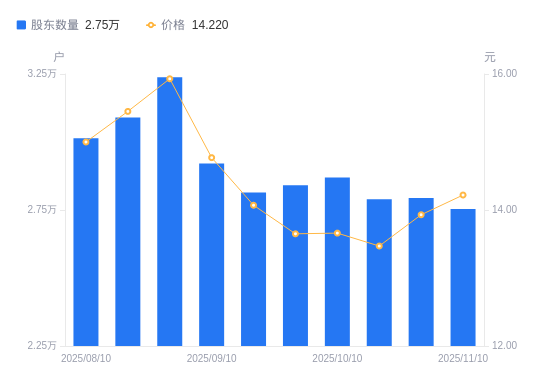 近一年(2024年12月10日至2025年10月31日),七彩化学A股股东户数从2.41万户,增加至2.79万户,增幅15.78%,区间股价上涨5.69%。