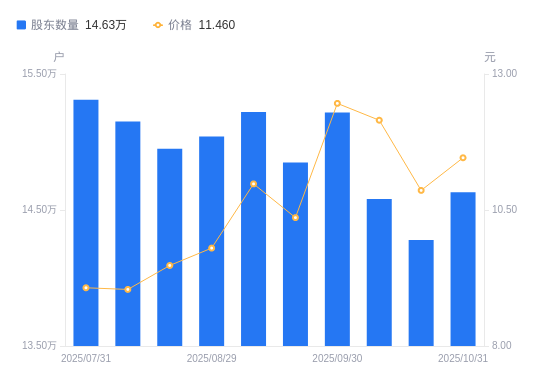 近一年(2024年10月31日至2025年10月31日),中国宝安A股股东户数从18.13万户,减低至14.63万户,降幅19.33%,区间股价上涨14.60%。