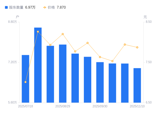 近一年(2024年11月20日至2025年11月10日),远望谷A股股东户数从6.9万户,增加至6.97万户,增幅1.01%,区间股价上涨37.71%。