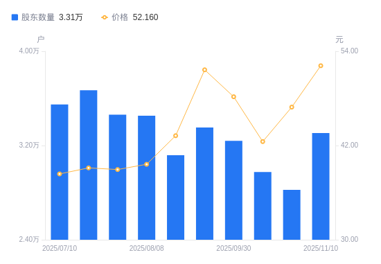 近一年(2024年12月10日至2025年11月10日),意华股份A股股东户数从3.48万户,减低至3.31万户,降幅5.13%,区间股价上涨29.43%。