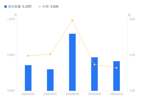 11月19日消息,数据显示,截至2025年10月31日,兴民智通A股股东总户数为5.1万户,较上期(2025年9月30日)减少1939户,降幅3.67%。公司最新A股总股本为6.68亿股,其中流通A股6.18亿股,户均持有流通A股数量为1.21万股,较上期增加444.66股,增幅3.81%;户均持流通A股市值7.07万元,较上期增加839.44元,增幅1.20%。