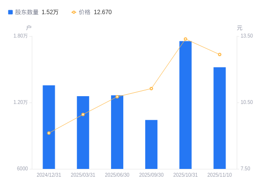 近一年(2024年12月31日至2025年11月10日),华瑞股份A股股东户数从1.36万户,增加至1.52万户,增幅11.99%,区间股价上涨35.07%。