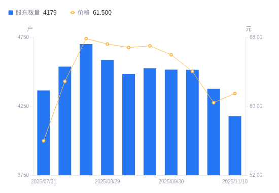 近一年(2024年11月20日至2025年11月10日),菱电电控A股股东户数从3684户,增加至4179户,增幅13.44%,区间股价上涨43.76%。