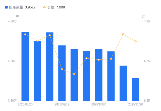 近一年(2024年11月20日至2025年11月20日),泰山石油A股股东户数从3.86万户,增加至3.95万户,增幅2.16%,区间股价上涨20.19%。
