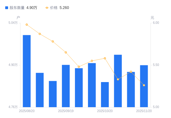 近一年(2024年11月29日至2025年11月20日),安凯客车A股股东户数从5.75万户,减低至4.9万户,降幅14.74%,区间股价下跌2.77%。