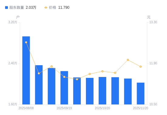 近一年(2024年11月20日至2025年11月20日),中设股份A股股东户数从1.5万户,增加至2.03万户,增幅34.62%,区间股价上涨9.17%。