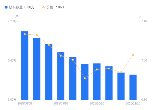 近一年(2024年11月20日至2025年11月20日),国投丰乐A股股东户数从6.66万户,减低至6.34万户,降幅4.84%,区间股价下跌0.98%。