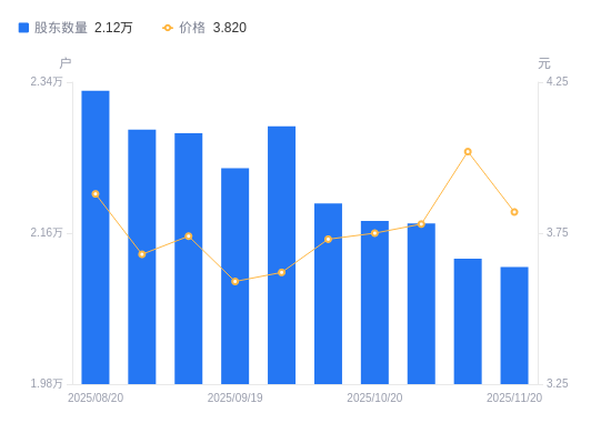 近一年(2024年11月20日至2025年11月20日),扬子新材A股股东户数从2.71万户,减低至2.12万户,降幅21.76%,区间股价上涨18.27%。