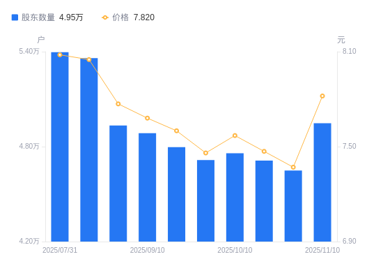 近一年(2024年11月20日至2025年11月20日),鲁北化工A股股东户数从5.41万户,减低至4.77万户,降幅11.82%,区间股价下跌1.69%。