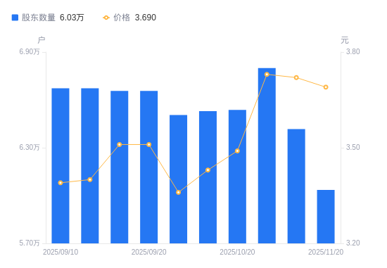 近一年(2024年11月20日至2025年11月20日),淮河能源A股股东户数从3.63万户,增加至6.03万户,增幅66.39%,区间股价上涨1.65%。