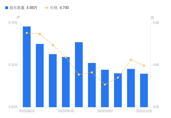 近一年(2024年11月20日至2025年11月20日),安诺其A股股东户数从5.8万户,减低至4.98万户,降幅14.22%,区间股价下跌11.95%。