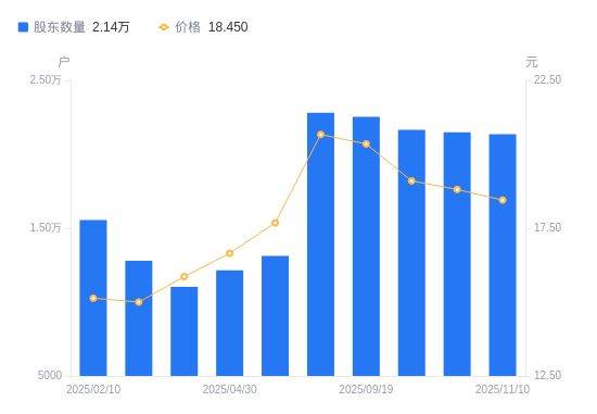 近一年(2024年12月31日至2025年11月10日),西菱动力A股股东户数从1.48万户,增加至2.14万户,增幅43.85%,区间股价上涨51.48%。
