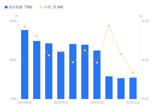 近一年(2024年11月20日至2025年11月20日),久量股份A股股东户数从8210户,减低至7550户,降幅8.04%,区间股价上涨15.86%。