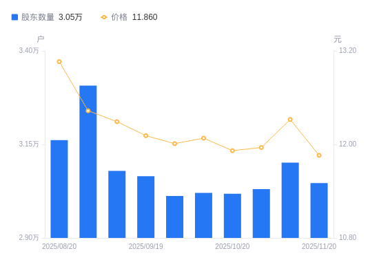 近一年(2024年11月20日至2025年11月20日),劲仔食品A股股东户数从1.95万户,增加至3.05万户,增幅55.99%,区间股价下跌0.79%。