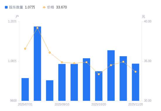 近一年(2024年11月20日至2025年11月20日),北路智控A股股东户数从1.05万户,增加至1.07万户,增幅1.88%,区间股价上涨3.12%。