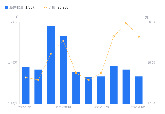近一年(2024年12月31日至2025年11月20日),浪莎股份A股股东户数从9742户,增加至1.3万户,增幅33.44%,区间股价上涨44.25%。
