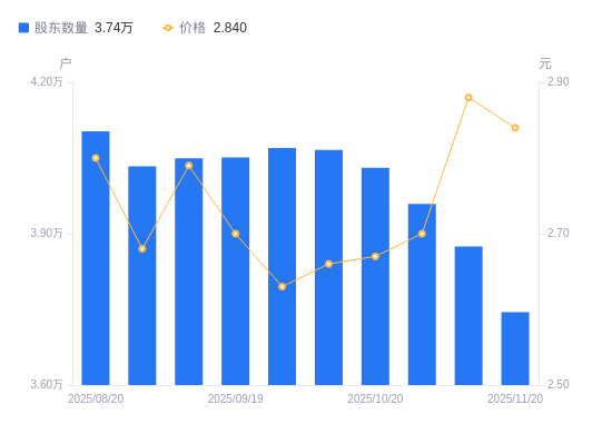 近一年(2024年12月31日至2025年11月20日),佳隆股份A股股东户数从5.29万户,减低至3.74万户,降幅29.26%,区间股价上涨9.57%。