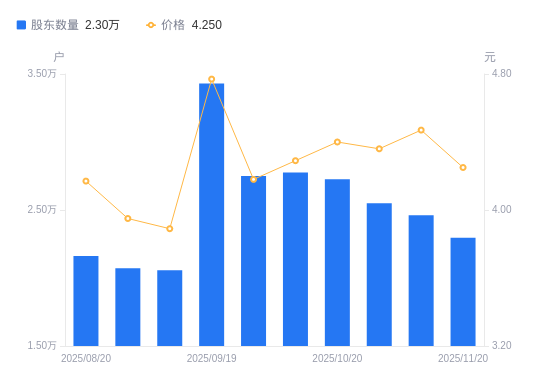 近一年(2024年11月20日至2025年11月20日),新宁物流A股股东户数从1.73万户,增加至2.3万户,增幅32.71%,区间股价上涨19.05%。
