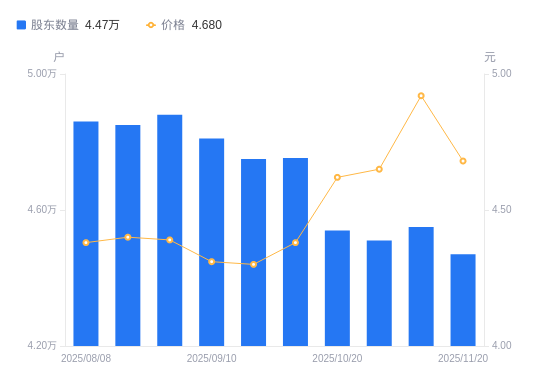 近一年(2024年11月20日至2025年11月20日),东南网架A股股东户数从5.18万户,减低至4.47万户,降幅13.71%,区间股价上涨2.41%。