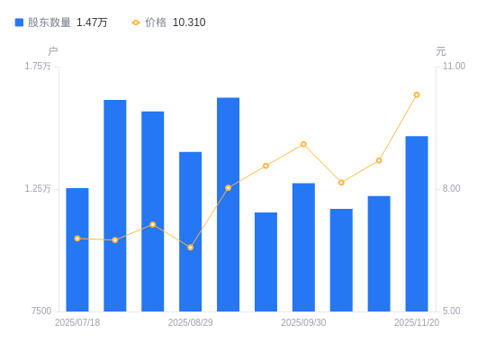 近一年(2024年11月20日至2025年11月20日),延江股份A股股东户数从1.35万户,增加至1.47万户,增幅8.39%,区间股价上涨87.76%。