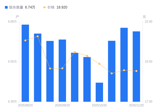 近一年(2024年11月20日至2025年11月20日),航发控制A股股东户数从5.65万户,增加至6.74万户,增幅19.33%,区间股价下跌14.57%。