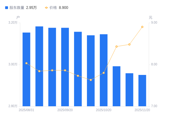 近一年(2024年11月20日至2025年11月20日),隆基机械A股股东户数从3.51万户,减低至2.95万户,降幅15.98%,区间股价上涨29.74%。