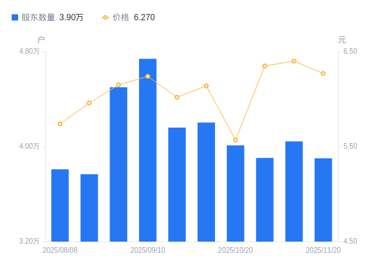 近一年(2024年11月20日至2025年11月20日),万顺新材A股股东户数从3.62万户,增加至3.9万户,增幅7.70%,区间股价上涨9.62%。