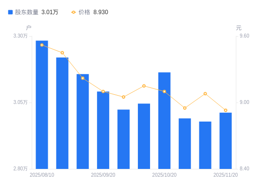 近一年(2024年11月20日至2025年11月20日),甘咨询A股股东户数从2.84万户,增加至3.01万户,增幅6.10%,区间股价上涨7.85%。