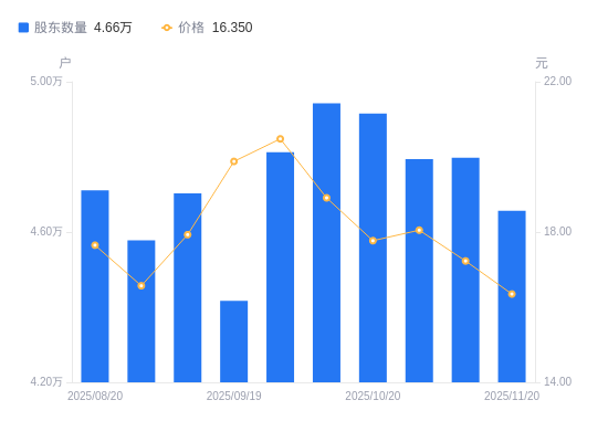 近一年(2024年11月20日至2025年11月20日),新时达A股股东户数从6.48万户,减低至4.66万户,降幅28.17%,区间股价上涨102.10%。